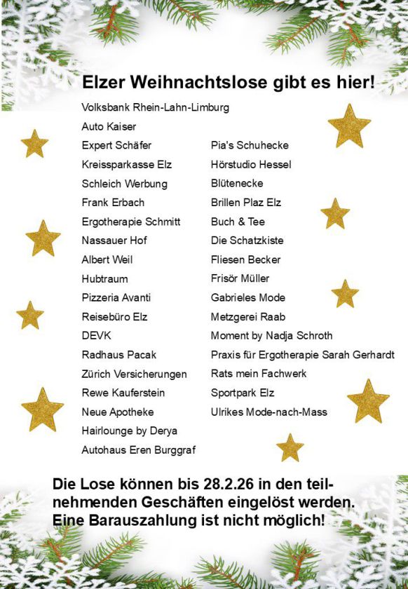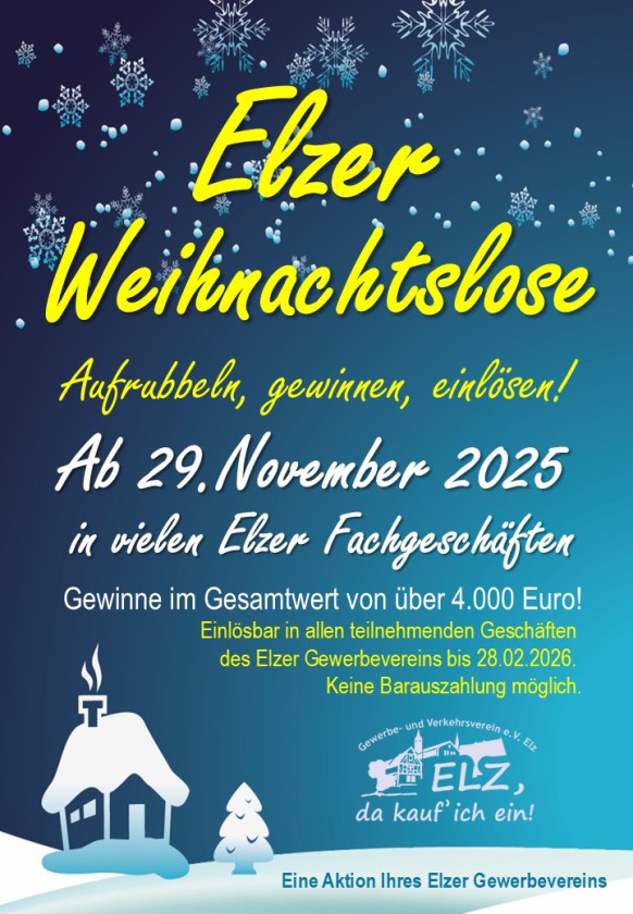 der Elzer Gewerbeverein hat auch dieses Jahr wieder eine Verlosung von insgesamt 80 attraktiven Preisen in der Vorweihnachtszeit vorbereitet und lädt Sie alle sehr herzlich ein, mitzumachen! Die Lose sind vom 25.11. bis 19.12.2019 in vielen Elzer Geschäften, Betrieben und Gaststätten erhältlich. Die Gewinner werden ab 21.12.19 auf der Internetseite des Elzer Gewerbevereins (www.gewerbeverein-elz.de) und per Aushang in den Elzer Banken bekannt gegeben! Wir drücken die Daumen und wünschen Ihnen viel Glück – vielleicht ist auch ein toller Gewinn für Sie dabei!